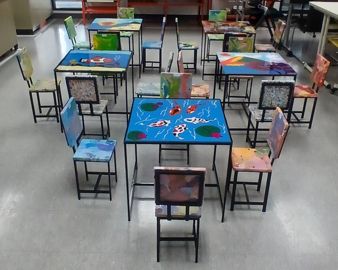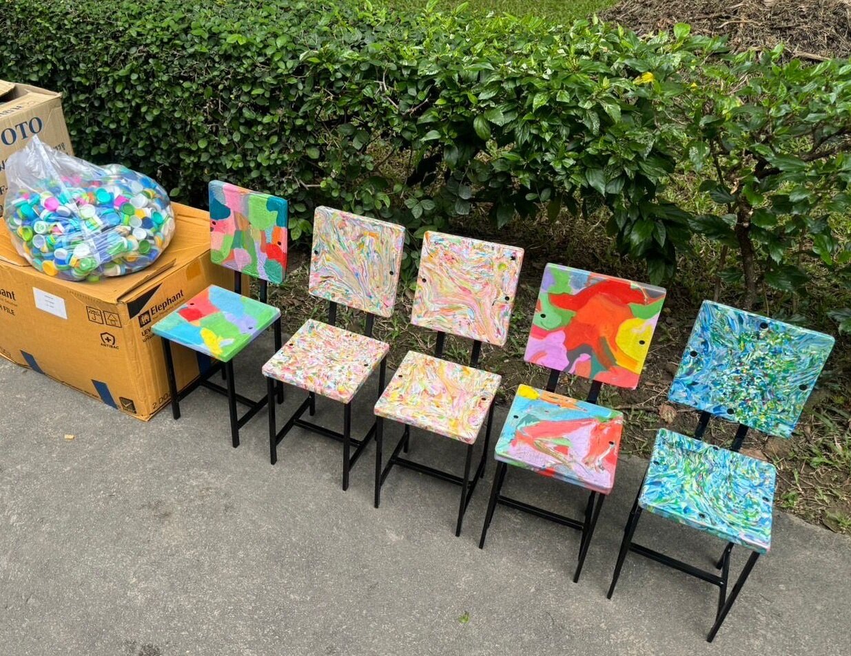 IJTTのグループ会社である IJTT (Thailand) Co., Ltd. は、リングギアの生産工程で生じる端材とペットボトルキャップを活用し、大学と連携してイスやテーブルを制作する取り組みを進めています。イスの背もたれや座面、テーブルの天板には、従業員が社内で収集したペットボトルキャップを使用。身近な素材を組み合わせることで、環境に配慮しながら新たな価値を創出しています。